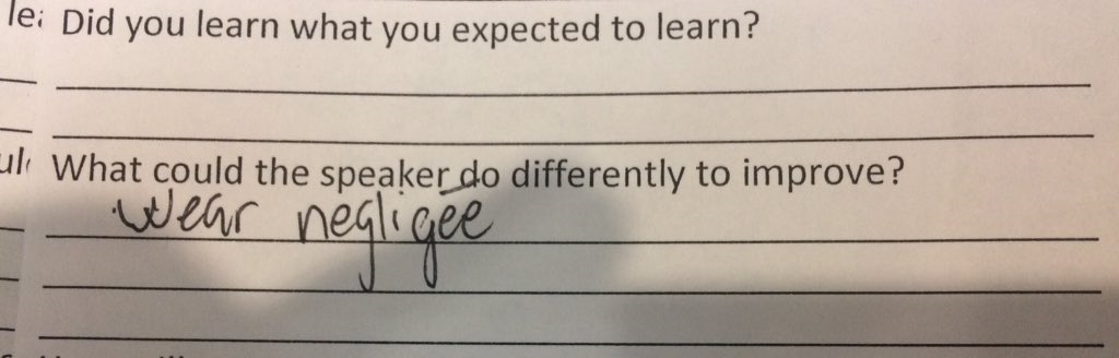 The question on the form was “What could the speaker do differently to improve?”. Acceptable answers typically are something like “speaker slower”, “more demos”, “fewer demos”, etc. However on this specific evaluation form the attendee wrote “wear négligée”. Jen was kind enough to post the evaluation form for us all to see.