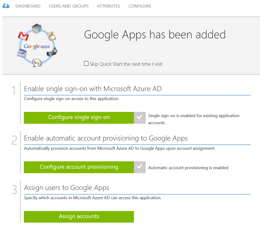 The only catch is that you need to already have your Google Apps account created and you have to have an account in the Google Apps account which has admin rights. You’ll be prompted to log into Google then test the connection. Once that’s done you’ll be taken back to the Azure AD application list. At the end of the wizard you’ll be prompted to select if you want to configure all your users in Google Apps or not. If you select to sync your users to Google Apps you can log into Google’s Admin screen and you should see all your users with accounts created.