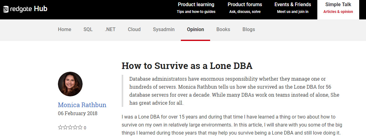 I am so thrilled to have the opportunity to expand my writing with my first Simple-Talk article posted. Simple- Talk is technical journal and community hub from Redgate. It in I discuss my passion for my work as a Lone DBA.