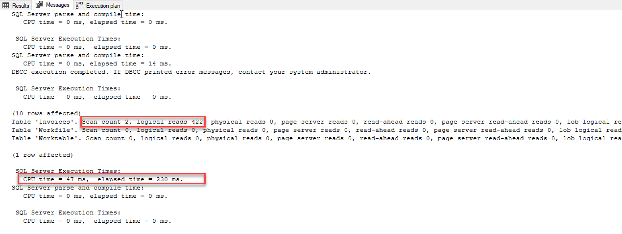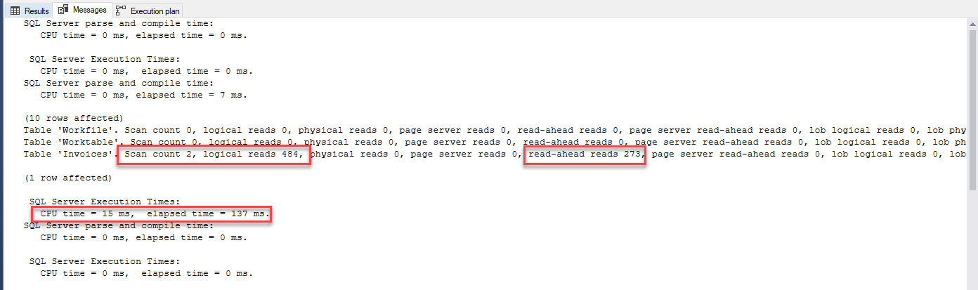 As I do with any performance tuning the first things that I note is CPU time and elapsed time then Ill note table scans and reads. We will use these metrics to measure our improvements. I would like you to take note of the tables it uses to complete the query. There is the Invoices table along with a Workfile and a Worktable it needed to use in order to return the desired results.