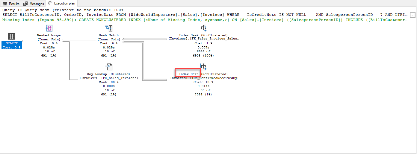 SET STATISTICS IO, TIME ON SELECT BillToCustomerID, OrderID, InvoiceDate FROM [WideWorldImporters].[Sales].[Invoices] WHERE IsCreditNote IS NOT NULL AND SalespersonPersonID = 7 AND LTRIM(RTRIM(ConfirmedReceivedBy)) ='Aile Mae' ;