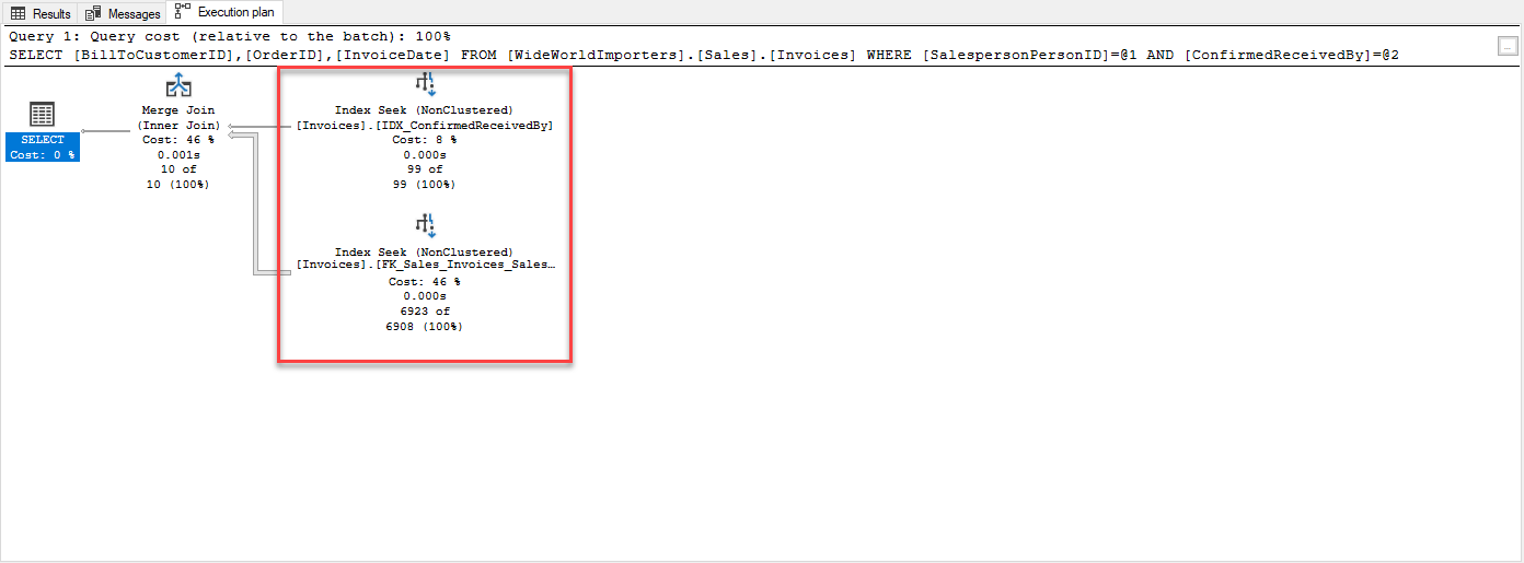 Now, you can see a huge improvement. We now are only doing 2 scans with 50 logical reads verses 422 and CPU time is now 0 compared 47ms. Our elapsed time even dropped from 230 to 127 which is over 100ms less. Furthermore, note that the missing index suggestion is now gone. It is important that you don’t just add indexes because the optimizer suggests it, wait until you are done tuning your code before addressing you index needs. Lastly note by making these changes the optimizer no longer requires the use of worktables nor workfiles.