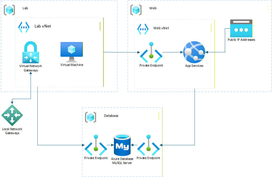 The next question is, how do we have access to the MySQL databases that are hosted in the Web environment? Well, that’s where the beauty of the cloud comes into play. Resources can have multiple private endpoints, with each private endpoint giving access from a vNet into that resource, with no ability for the resource to route traffic back across that private endpoint. So our Lab environment has a private endpoint to the Azure SQL DB for MySQL database server, but the database has no access to the Lab environment; it’s a one-way connection as shown in the diagram below.